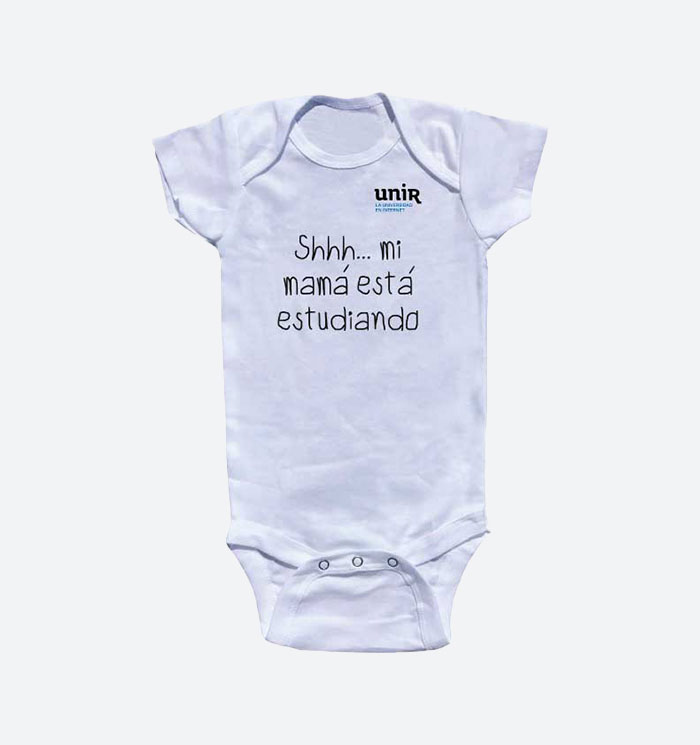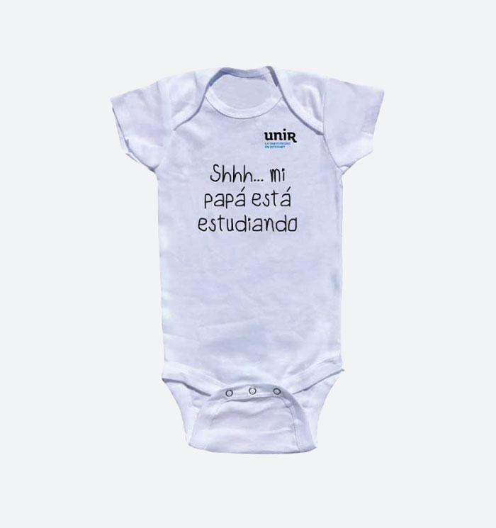 Tela poli algodón logo estampado con frase: Mi papá es magíster / Mi mamá es magíster / Shhhh… mi papá esta estudiando / Shhhh… mi mamá esta estudiando.